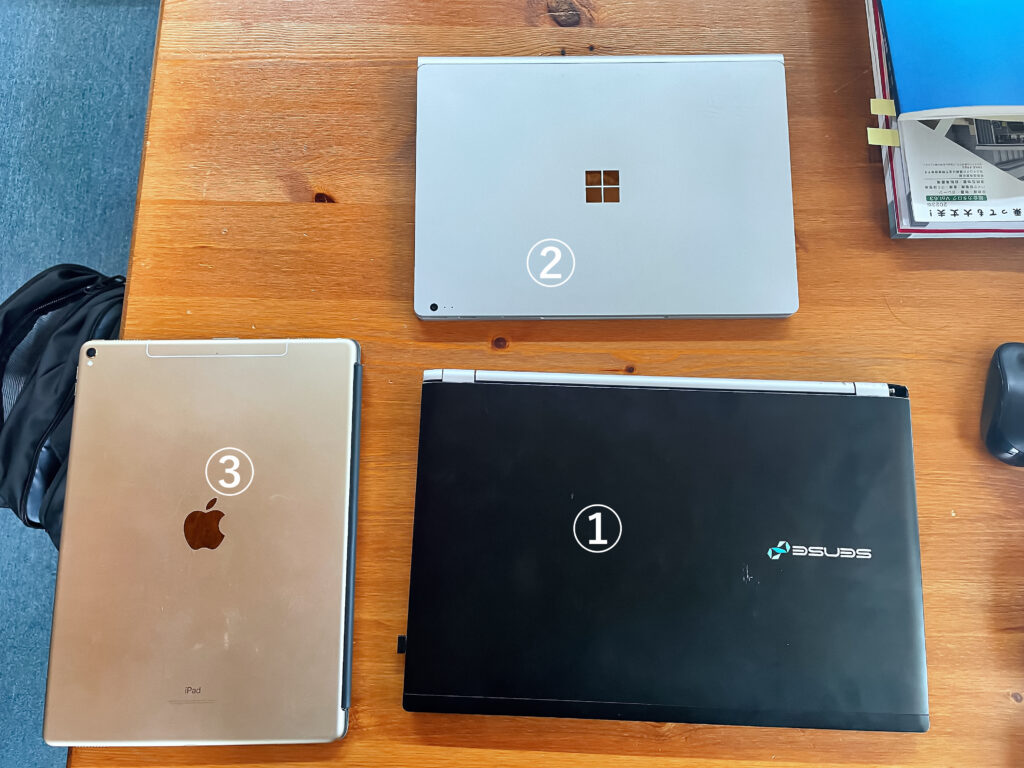 ②マイクロソフトのsurfacebook2・・・こちらもメインに近いパソコンです。①と同じく、出荷前にスペックアップのカスタマイズしたもので、グラフィックボードを積んでいます。これも重い。